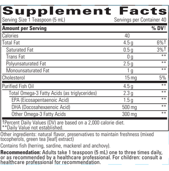 Pure Omega Liquid provides a total of 2300 mg (2.3 grams) omega-3s in one teaspoon.
