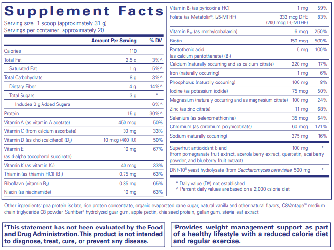 Vegetarian protein, DNF-10® peptides, multivitamin/mineral complex, omega-3 fatty acids and superfruit antioxidants to support healthy weight management.