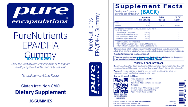 PureNutrients EPA/DHA Gummy is a unique fish oil emulsion offering enhanced-absorption omega-3 essential fatty acids in a convenient, lemon-lime flavored soft chew.