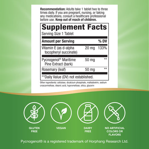 Pycnogenol® is an extract made from the bark of the Maritime Pine. Pycnogenol contains naturally occurring proanthocyanidins, organic acids and other biologically active components. Vitamin E is a powerful antioxidant and a potent free-radical scavenger.