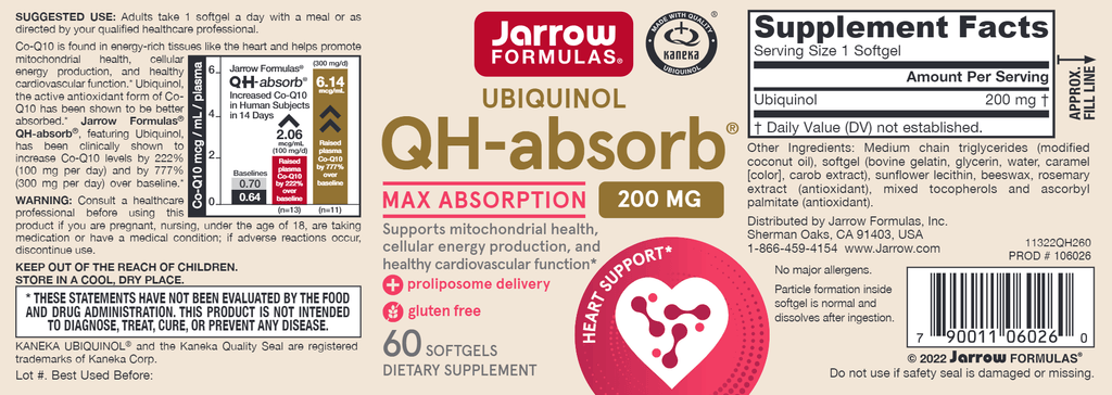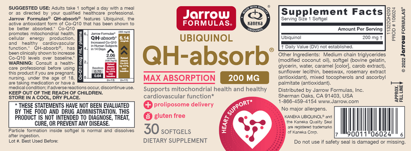 Co-Q10 is found in energy-rich tissues like the heart and helps promote mitochondrial health, cellular energy production, and healthy cardiovascular function.* Ubiquinol, the active antioxidant form of CoQ10 has been shown to be better absorbed.* Jarrow Formulas® QH-absorb®, featuring Ubiquinol, has been clinically shown to increase Co-Q10 levels by 222% (100 mg per day) and by 777% (300 mg per day) over baseline.*