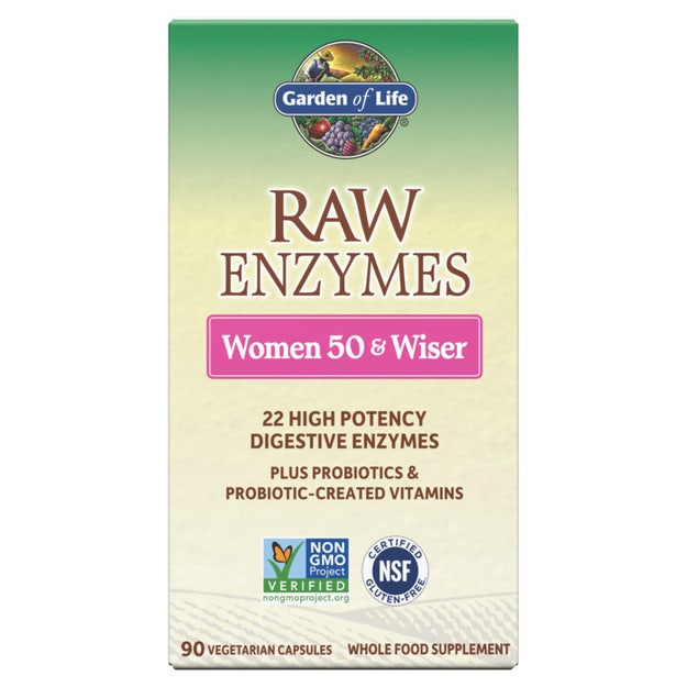 Garden of Life RAW Enzymes Women 50 & Wiser delivers higher activity per serving of a broader range of enzymes than any other digestive formula.† RAW Enzymes Women 50 & Wiser provides 22 powerful digestive enzymes, with increased carb-digesting enzymes (relative to the other RAW Enzymes formulas), as well as increases proteases in order to meet the needs of women 50+. RAW Enzymes also contains probiotic-created vitamins, minerals and antioxidant enzymes, including glutathione, catalase and SOD along with powerful probiotics that provide added support and act as “enzyme factories”—generating additional enzymes—working overtime for extraordinary digestive health.† Enzymes can aid in the digestion of dairy, grains, sugars, nuts, seeds, beans, broccoli and cabbage as well as other difficult-to-digest foods. As women age, they tend to experience a drop in stomach acid production which impacts protein digestion. RAW Enzymes Women 50 & Wiser has been specifically formulated to meet the unique digestive and overall health needs of women over 50—with amplified strength of carbohydrate-digesting enzymes plus powerful protein-digesting enzymes.†
