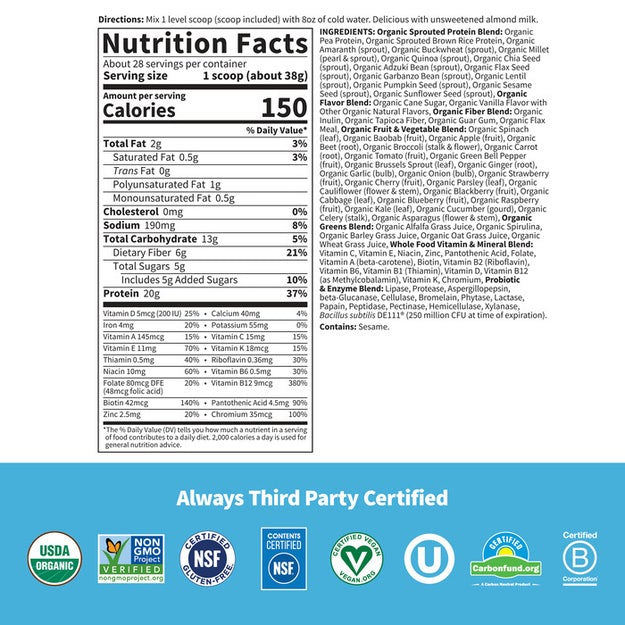 You have a busy, on-the-go life and lifestyle, but you still want to eat healthy, so fast food is just not an option for you. That’s why there’s Raw Organic Meal - convenient, organic shake and meal replacement that’s packed with 44 superfoods that not only satisfies your hunger, but also is naturally filling while boosting energy, and provides you with the protein, fiber, vitamins and minerals you would find in a healthy shake or meal of raw foods. A one-scoop serving delivers 20 grams of clean Certified USDA Organic and Non-GMO Project Verified protein, while two scoops pack a whopping 40 grams of clean organic protein—all from 13 organic sprouted grains and seeds. RAW Organic Meal also includes fruits and vegetables, greens juices, has live probiotics and enzymes as well as 21 whole food vitamins and minerals. Just as important is what’s not in RAW Organic Meal. It has no gluten, soy, dairy, tree nuts, filler ingredients, artificial colors, flavors, sweeteners or preservatives. And it’s RAW—since heat and processing can denature proteins.