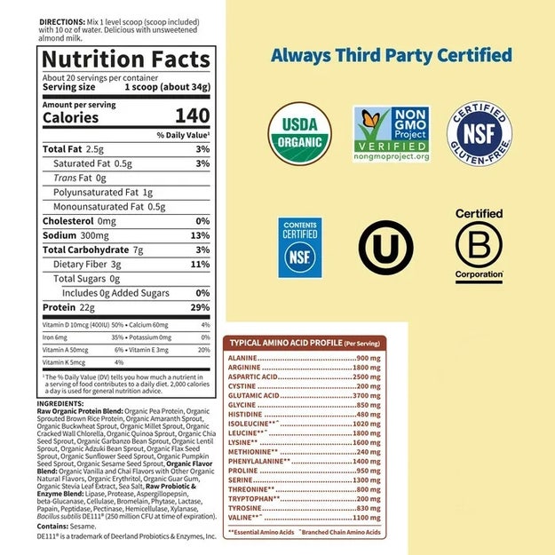 Raw Organic Protein is a Certified Organic, Non-GMO Project Verified RAW Vegan Protein powder made with 13 Raw sprouted proteins delivering 22 grams of protein that is dairy free with a complete profile of all the essential amino acids along with added whole food fat-soluble vitamins, probiotics and enzymes.