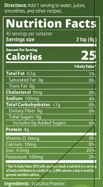 Spirulina, Arthrospira platensis, is a blue-green algae that has been cultivated and used as a complete food for thousands of years. In the Aztec culture it was called “Tecuitlatl” and was produced, collected and sold dried in cakes. The protein in spirulina is unusual for a plant-based source as it is “complete”. That means it contains all of the “essential” amino acids, those that our body cannot manufacture and must be consumed in food. It contains abundant amounts of many vitamins and minerals. For example it contains about 2.5 times the % daily value of vitamin A and a significant amount of iron. Because this iron is in an highly bioavailable form Spirulina is an excellent food to use to ensure adequate iron intake, especially for vegans.
