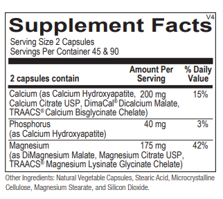 Reacted Cal-Mag provides 200 mg of elemental calcium and 175 mg of elemental magnesium per serving, each ideally formulated using three mineral forms to ensure maximum absorption. While most mineral supplements use only a single source of minerals, which can easily overwhelm a single pathway of absorption and limit uptake, Reacted Cal-Mag leverages the benefit of multiple pathways of absorption by using three different mineral forms.