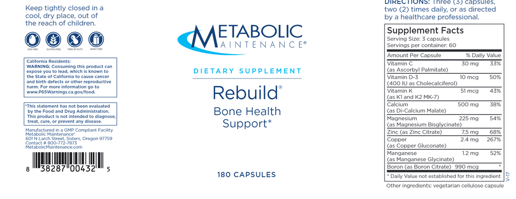 Maintaining bone health is a critical factor in maintaining mobility and independence as we age. Rebuild® is a full-spectrum nutritional product designed to support bone health in patients at risk of osteoporosis. In addition to calcium and magnesium, Rebuild® contains vitamin D, vitamin K, zinc, and trace minerals important to bone health. Deficiencies of these nutrients can slow bone production or accelerate bone loss.