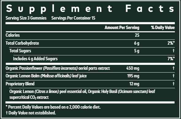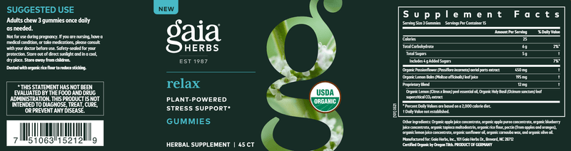 Gaia Herbs' Certified Organic Relax Gummies contain a specially formulated blend of herbs traditionally used for maintaining emotional well-being and supporting a sense of calm and relaxation, including Passionflower, Holy Basil, and Lemon Balm.* They’re made without any preservatives or artificial colors or flavors—and are sweetened only with real fruit—for 100% plant-powered stress support that works with your healthy lifestyle.*