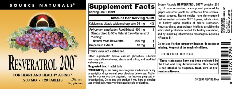 Source Naturals Resveratrol 200™ contains 200 mg of pure resveratrol, a compound produced by grapes and other plants for protection from environmental stresses. Recent studies have demonstrated that resveratrol activates SIRT I genes, which mimic the healthy aging benefits of caloric restriction. Resveratrol may support heart health by providing the antioxidant protection needed for healthy circulation, and by inhibiting inflammation messengers including NF kappa B.*