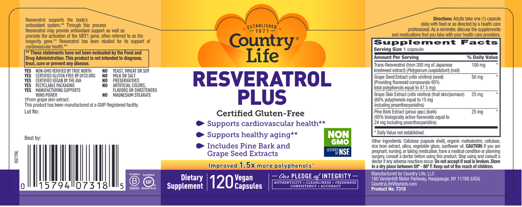 Resveratrol supports the body’s antioxidant system as well as cardiovascular health and healthy aging.** It is an antioxidant-like compound found in red wine that helps neutralizes harmful free radicals in cells.** Resveratrol has also been shown to promote the activation of the SIRT1 gene, often referred to as the longevity gene.** Country Life’s Resveratrol Plus also includes pine bark and grape seed extracts.