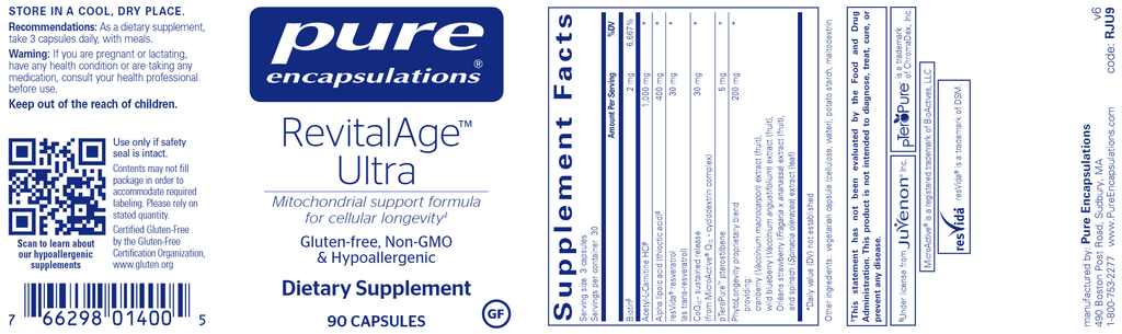 RevitalAge™ Ultra promotes healthy aging through maintaining youthful gene expression, mitochondrial function, cellular energy production and antioxidant protection. RevitalAge™ Ultra is a blend of clinically researched supplements to help with the aging process.