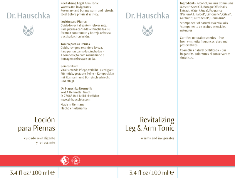 Apply evenly to the legs, feet and arms, massaging towards the heart. Repeat as needed. Allow to absorb before dressing. For dry skin, blend Revitalizing Leg & Arm Tonic with any Dr. Hauschka Body Oil. Protect against light and heat.