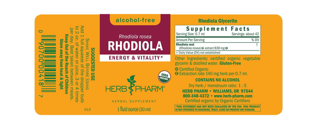 Herb Pharm prepares Rhodiola Glycerite from the dried root of Rhodiola rosea plants. To assure optimal extraction of the herbs bioactive flavonoids and delicate rose flavor, the roots are harvested at their optimal potency, carefully shade-dried, then thoroughly extracted.