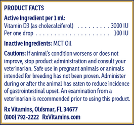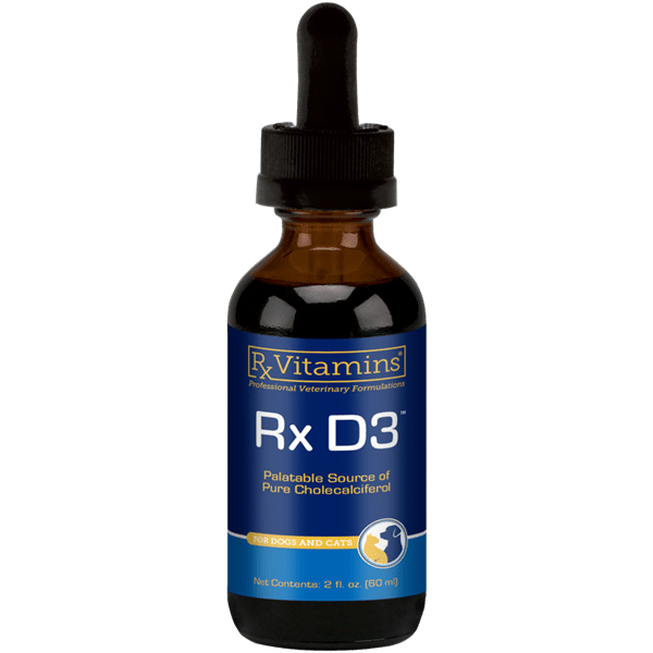 Rx D3™ contains cholecalciferol, the precursor to Vitamin D3 for all animals. The cholecalciferol is blended with MCT oil and diluted sufficiently to enable safe usage in animals as small as 4 kg.