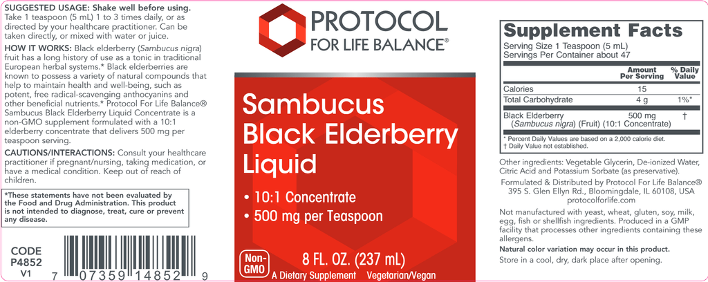 Black elderberry (Sambucus nigra) fruit has a long history of use as a tonic in traditional European herbal systems.* Black elderberries are known to possess a variety of natural compounds that help to maintain health and well-being, such as potent, free radical-scavenging anthocyanins and other beneficial nutrients.* Protocol For Life Balance® Sambucus Black Elderberry Liquid Concentrate is a non-GMO supplement formulated with a 10:1 elderberry concentrate that delivers 500 mg per teaspoon serving.