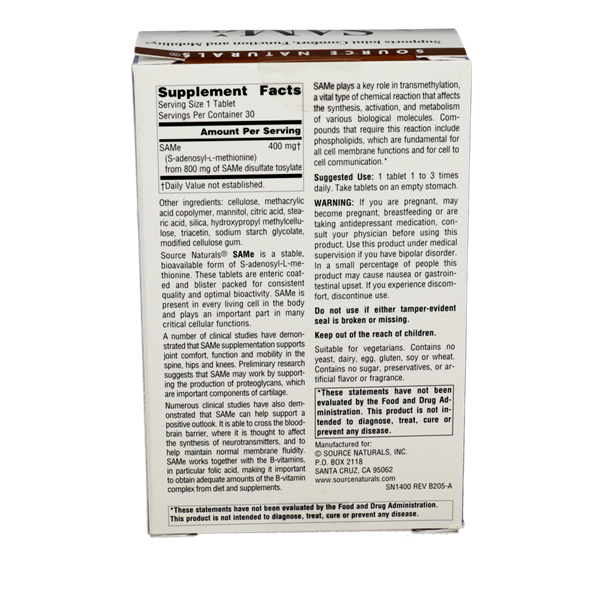 Source Naturals® SAMe is a stable, bioavailable form of S-adenosyl-L-methionine. These tablets are enteric coated and blister packed to prevent breakdown and inactivation of the ingredients.