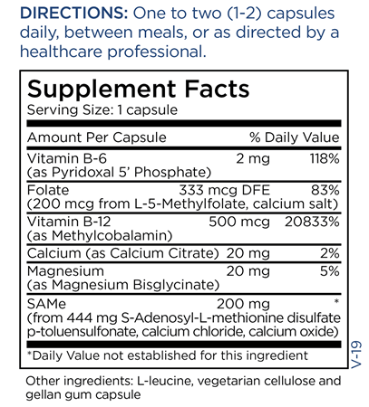 Vitamins B-6, B-12, and folate are necessary cofactors in the methylation cycle, allowing the reactions required for SAMe’s benefits. They are provided in this formula in their bio-active forms: pyridoxal 5 phosphate, methylcobalamin, and L-methylfolate. Magnesium is a cofactor for neurotransmitter synthesis and transmission.