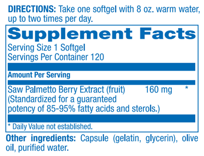 Saw Palmetto berries (serenoa repens) contain a variety of fatty acids and sterols which can help maintain prostate and urinary system health, primarily for men over 40 years of age.