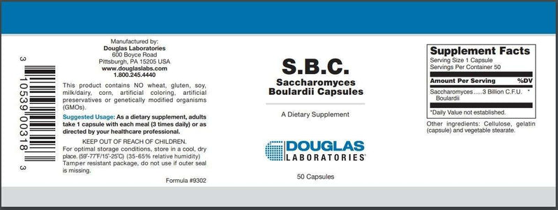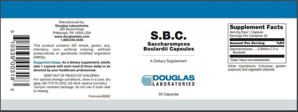 S.B.C., provided by Douglas Laboratories, supplies 3 billion C.F.U. of beneficial Saccharomyces boulardii for gastrointestinal support.†