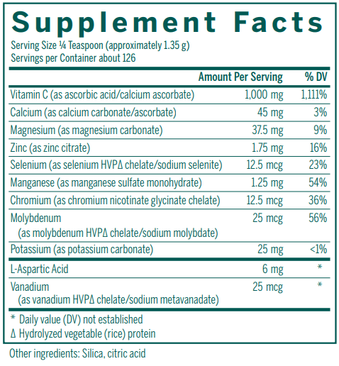 Add water or juice to ¼ teaspoon of Scorbatate and mix. Take once daily, or as recommended by your health care practitioner.