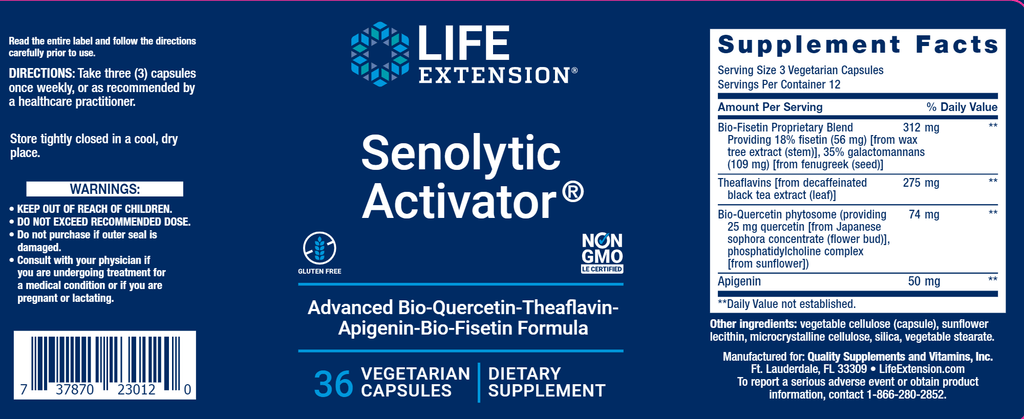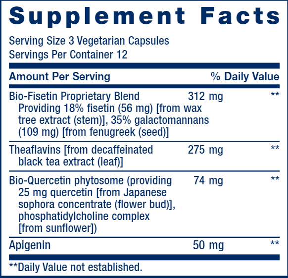 Senolytic Activator® combines black tea theaflavins, the plant-derived flavonoid apigenin, and ultra-absorbable forms of the bio-flavonoids quercetin and fisetin to help manage senescent cell burden and promote systemic rejuvenation.