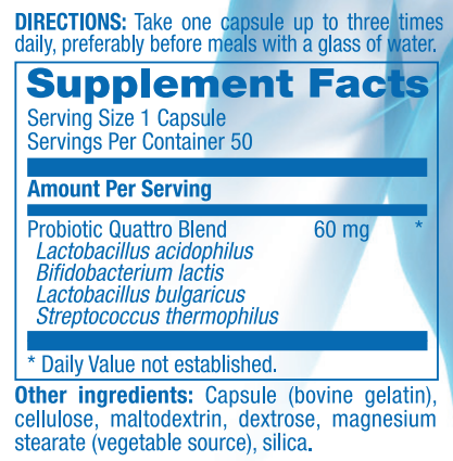 Beneficial bacteria are essential for optimal gut function. In addition, the majority of our immune system is housed within the digestive tract, making is even more important to maintain proper gut health. Just one capsule of our Probiotic Complete contains four different strains of the “good” bacteria needed for a healthy body. The unique capsule matrix protects the bacteria and allows delivery to the small intestines. What’s more, while this product doesn’t require refrigeration – making it convenient for travel, work, and outdoor activities, storing it in a refrigerator extends the potency.