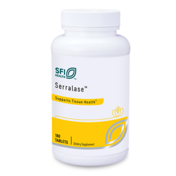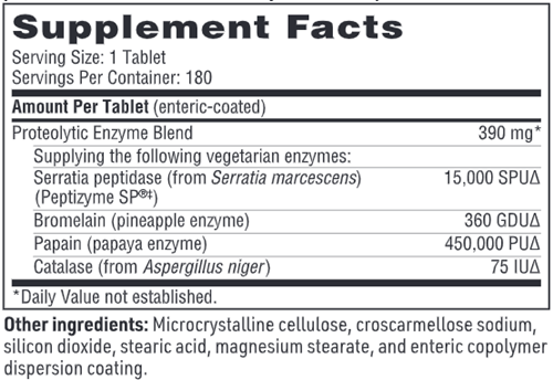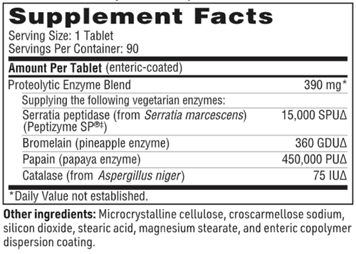 Serralase™ provides powerful, vegetarian proteases for use as a systemic enzyme formulation to support tissue repair and maintenance.† Proteolytic enzymes activate cells mediating tissue repair and break down cellular debris associated with inflammation metabolism, thereby supporting healthy vascular permeability, modulating tissue restorative processes, and speeding repair.† Serratia peptidase (Peptizyme SP®‡), a highly active and specific endopeptidase, is widely used to assist recovery after surgery or trauma, support joint function, and assist the respiratory system in breaking down and clearing mucus.† Serratia peptidase also helps protect sensitive gastrointestinal tissue from irritation that can affect tissue health and intestinal comfort.† Research shows Serratia peptidase breaks down biofilm and favorably modulates the immune response.† Highly purified, stable Serratia peptidase cultured from a bacterial source is used. Bromelain (from pineapple) and papain (from papaya) broaden the proteolytic actions as each enzyme acts at different points on protein molecules. Catalase (bacterial source), a ubiquitous body enzyme, renders hydrogen peroxide harmless. Enteric coating protects enzyme activity against degradation by stomach acid.