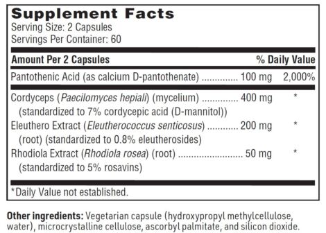 Eleuthero, Rhodiola, and Cordyceps mushrooms have long been used in traditional medicine for their adaptogenic actions, assisting your adrenal glands and the hypothalamic-pituitary-adrenal axis (HPA-axis) to respond to various types of physiological stress. Together with pantothenic acid (vitamin B5), these adaptogens can help your body maintain a state of balance.†