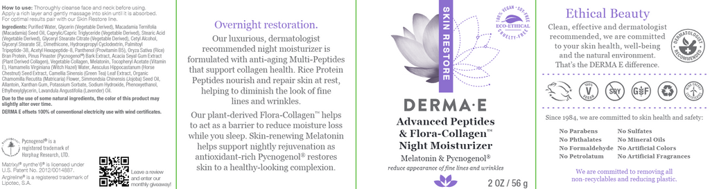 Derma E’s luxurious, dermatologist recommended night moisturizer is formulated with anti-aging Multi-Peptides that support collagen health. Rice Protein Peptides nourish and repair skin at rest, helping to diminish the look of fine lines and wrinkles. Plant-derived Flora-Collagen™ helps to act as a barrier to reduce moisture loss while you sleep. Skin-renewing Melatonin helps support nightly rejuvenation as antioxidant-rich Pycnogenol® restores skin to a healthy-looking complexion.