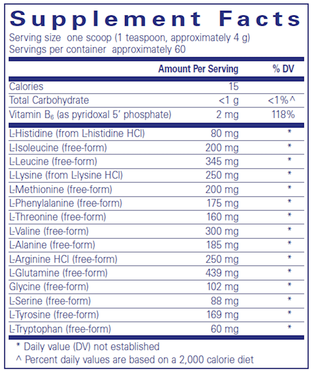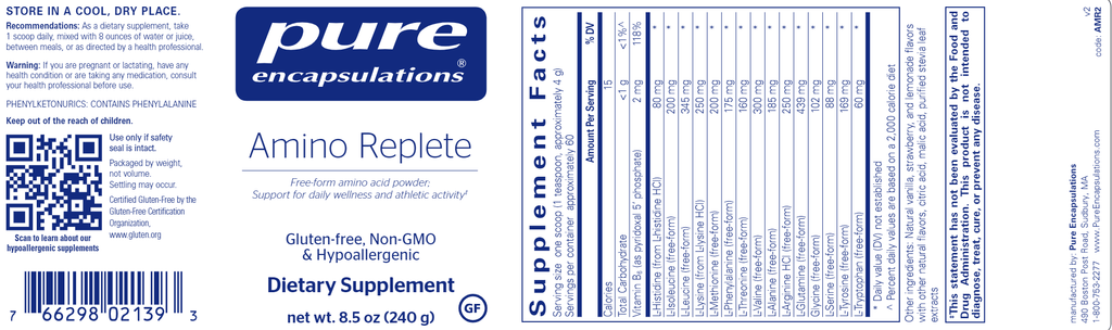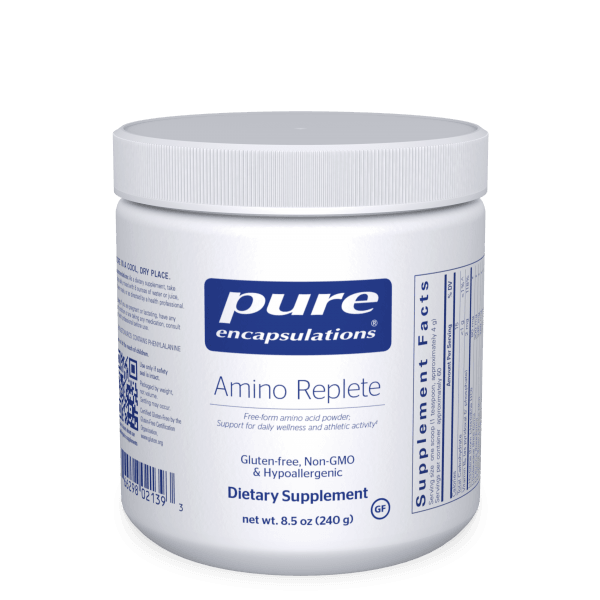 Amino Replete is a complex of free-form amino acids in naturally occurring ratios, providing support for athletic activity, cognitive health, immune function, and daily wellness.