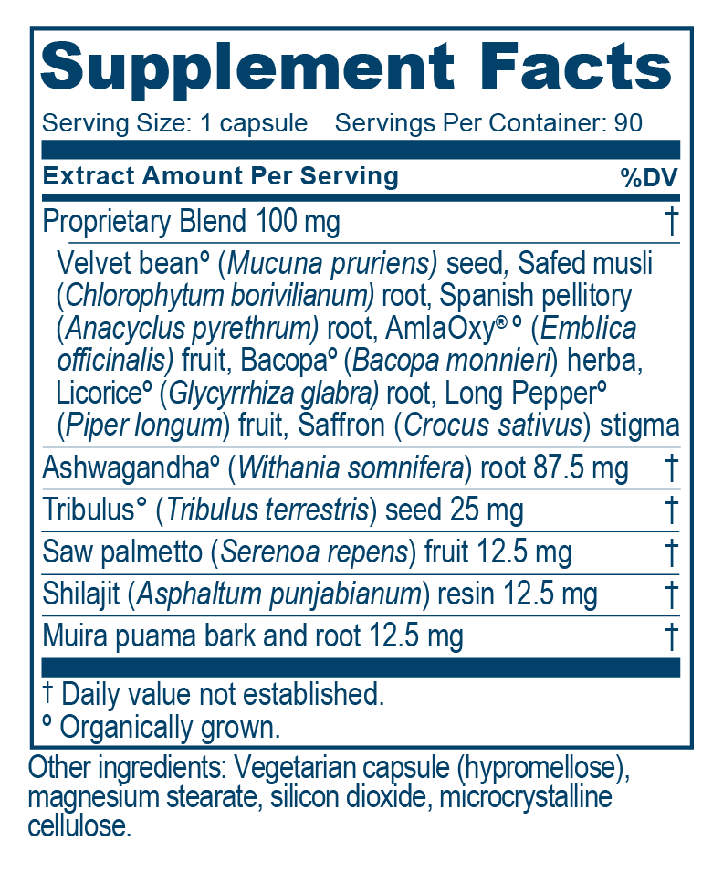 The unique combination of Ashwagandha (Indian ginseng), Tribulus terrestris, Shilajit, saw palmetto, and Muira puama, in a patented blend of Crocus sativus, Emblica officinalis (Amla), Piper longum (pippali), Glycyrrhiza glabra, Bacopa monnieri, Mucuna pruriens, and Anacyclus pyrethrum, acts as aphrodisiac. This formula supports circulatory, adrenal and endocrine function*.
