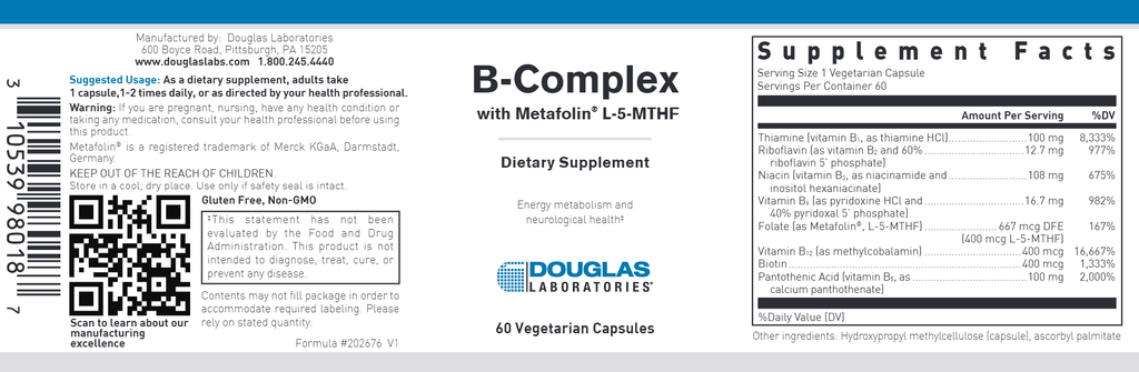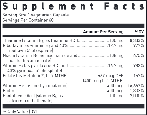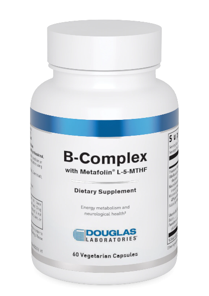B-Complex is a combination of B vitamins, including vitamins B1, B2, B3, B5, B6, B12, biotin and folate (as Metafolin® L-5-MTHF), all of which are provided in their optimal bioavailable and functional forms.‡