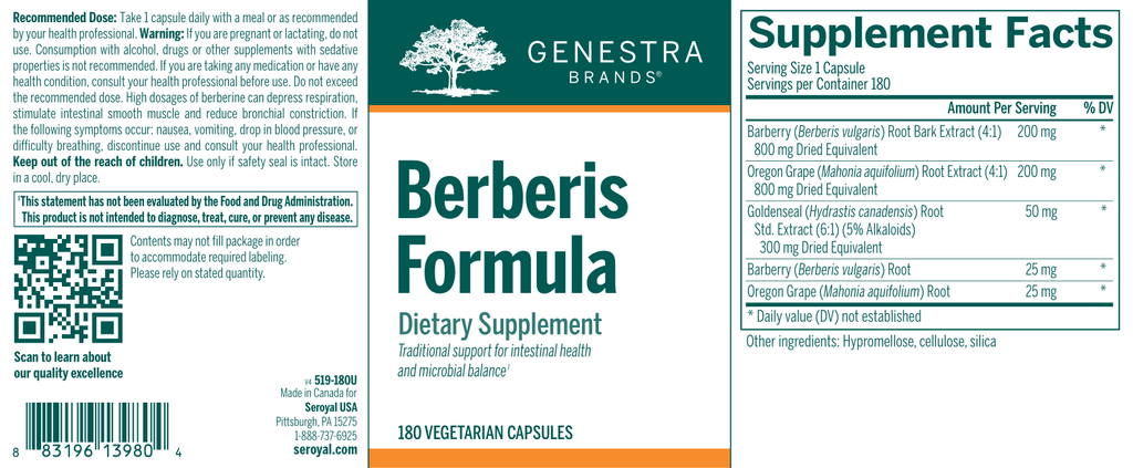 Risk Information: If you are pregnant or breastfeeding, do not use. If symptoms persist or worsen, consult your healthcare practitioner. If you have a kidney disorder, blood pressure problems, heart or respiratory condition, consult your healthcare practitioner prior to use. Consumption with alcohol, other medications and/or natural health products with sedative properties is not recommended. Do not exceed the recommended dose. Discontinue use and consult your healthcare practitioner if the following symptoms occur: nausea, vomiting, drop in blood pressure and/or difficulty breathing. High dosages of berberine can depress respiration, stimulate intestinal smooth muscle and reduce bronchial constriction.
