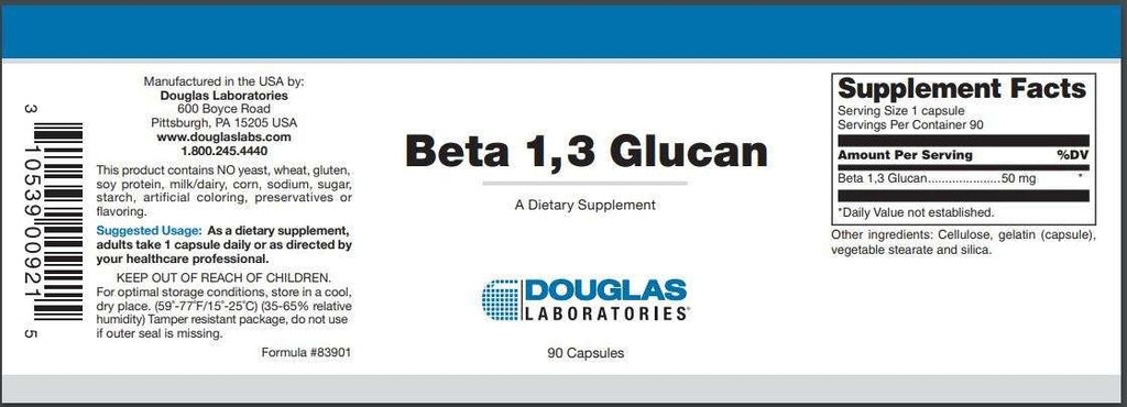 Beta 1,3 Glucan, provided by Douglas Laboratories, provides 50 mg of the dietary fiber beta-glucan, i.e. repeating units of beta-D-glucose joined together in beta-(1®3) linkages.