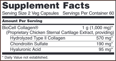 BioCell Collagen® is a versatile nutritional supplement that supports both joint health and moisture retention in mature skin. This patented, pre-digested complex from chicken sternal cartilage has natural hydrolyzed collagen and other naturally occurring elements of healthy connective tissues, including chondroitin and hyaluronic acid. With BioCell Collagen® you can promote healthy joint function, comfortable movement, and strong connective tissue while maintaining normal moisture levels in aging skin.