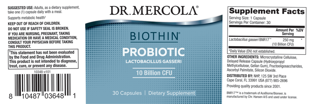 Each 250 mg serving of Biothin® Probiotic provides 10 billion CFU of beneficial probiotics from metabolic health supporting Lactobacillus gasseri BNR17™, and is acid- and bile-tolerant for optimal performance.