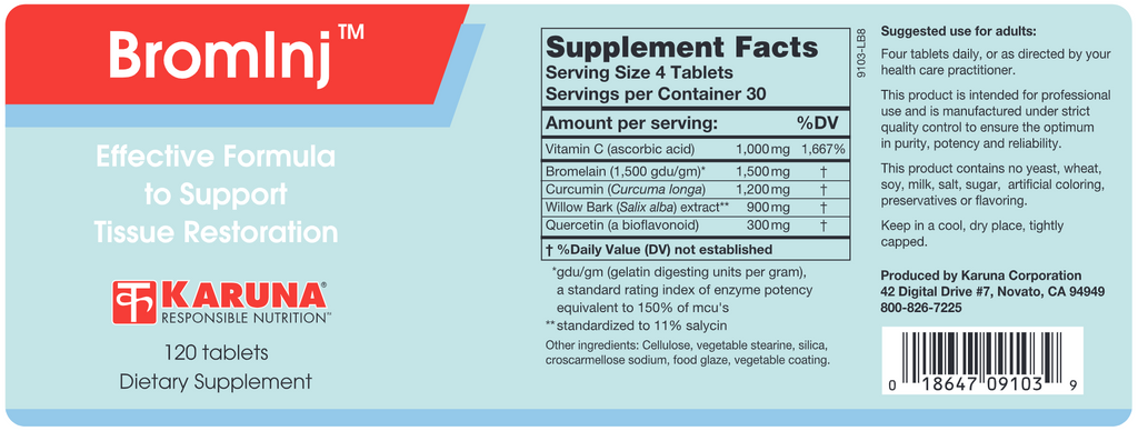BromInj is a powerful formulation containing high potencies of proteolytic enzymes, botanical extracts, quercetin, and vitamin C to support homeostasis during the healing process. In addition to bromelain for proteolytic activity, BromInj contains purified curcumin from turmeric, known for its antioxidant activity, and willow bark, a natural source of salicylates. Vitamin C and quercetin, a bioflavonoid, are included to facilitate normal reparative activities in various body tissues.* BromInj works best when taken on an empty stomach.