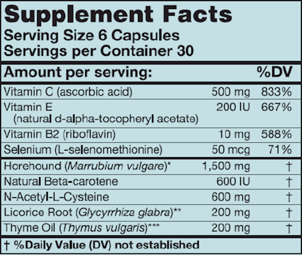 Protection against oxidative stress is crucial in lower respiratory tissues involved in oxygen exchange. N-acetylcysteine (NAC) is a precursor of the antioxidant glutathione, and is effective for supporting the bronchopulmonary tissues and supporting general well-being. BronchEze includes additional classic antioxidant support nutrients such as vitamins C and E, carotene, riboflavin, and selenium, many of which may be insufficient in Western diets. These nutrients also help maintain optimal immune system function. Horehound and licorice extracts, and thyme oil, are traditional botanicals and tonics for lung support.*
