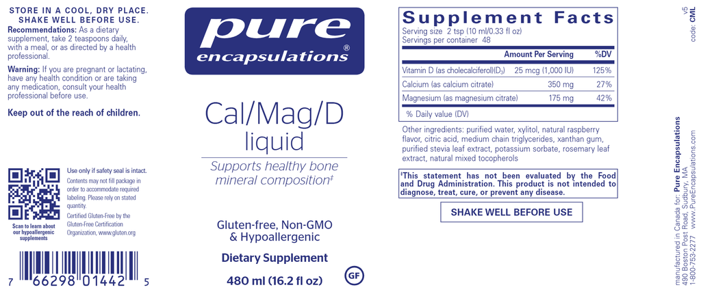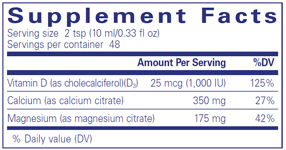 Cal/Mag/D liquid offers a 2:1 ratio of calcium to magnesium combined with vitamin D3 to promote calcium utilization and enhance healthy bone mineralization.