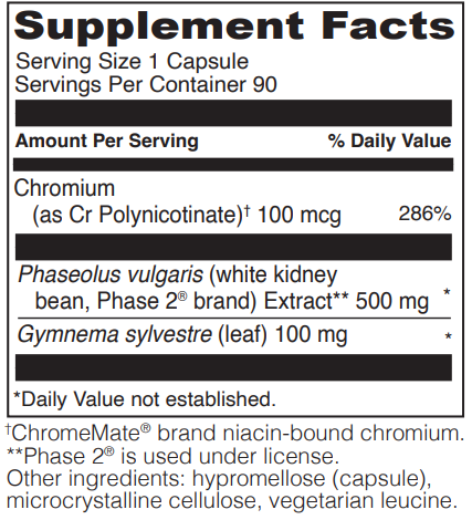 As vegetarian dietary supplement to help limit carbohydrate absorption, Carb-Down™ is a unique combination of the Phase 2® brand starch neutralizer, Gymnema sylvestre, and Chromemate® brand chromium polynicotinate.* Phase 2® starch neutralizer is an extract from the white kidney bean (Phaseolus vulgaris). Research shows that this extract can block the absorption of carbohydrates (from starch) because it contains a protein component that inhibits the enzyme alpha-amylase from breaking down carbohydrates from foods.* When this enzyme is blocked, the starch that's eaten cannot be converted to fat.* In a recent double-blind study in humans, Phase 2® starch neutralizer decreased the percentage of caloric burden from complex carbohydrates by 60%.* The addition of Gymnema sylvestre and Chromemate® is to support appetite control and glucose metabolism.*