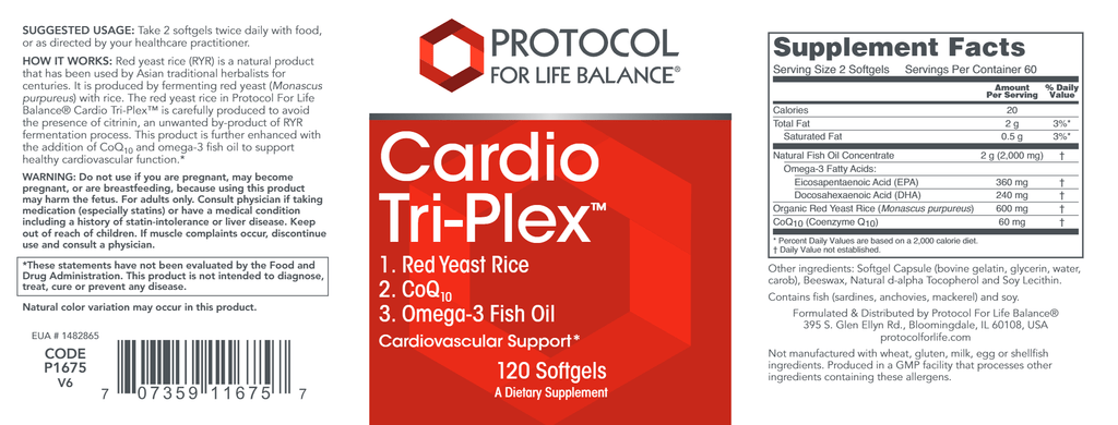 Red yeast rice (RYR) is a natural product that has been used by Asian traditional herbalists for centuries. It is produced by fermenting red yeast (Monascus purpureus) with rice. The red yeast rice in Protocol For Life Balance® Cardio Tri-Plex™ is carefully produced to avoid the presence of citrinin, an unwanted by-product of RYR fermentation process. This product is further enhanced with the addition of CoQ10 and omega-3 fish oil to support healthy cardiovascular function.