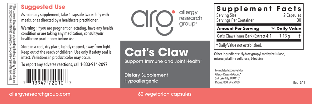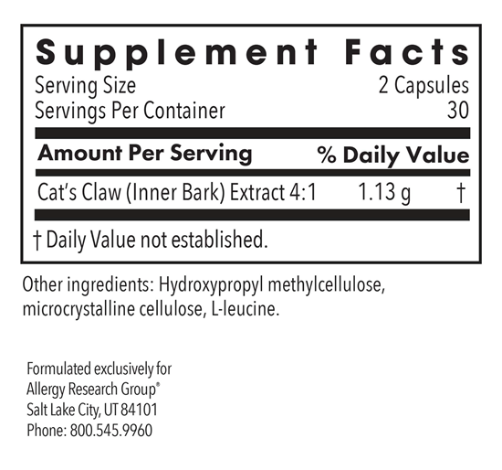 Cat's Claw or Uña de Gato (Uncaria tomentosa) is an herb that grows wild in the highlands of the Peruvian Amazon. The native Ashanica Indians have used the inner bark of cat's claw for possibly thousands of years.* Recent research in Europe and China has identified the alkaloid compounds in cat's claw that possess antioxidant properties. Allergy Research Group's cat's claw is derived from only the inner bark.
