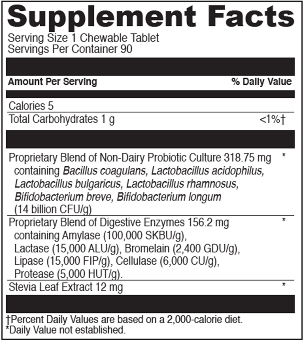 Delicious tropical punch-flavored chewable tablet contains probiotics and digestive enzymes to support children's digestive health, regularity and microflora balance in the GI tract.*