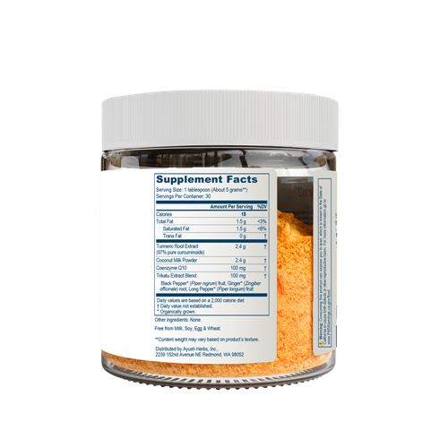 COCURCUMIN™ is a natural coconut flavored drink mix that uses traditional methods to enhance the bioavailability of curcuminoids. Curcumin is difficult for the body to absorb. Absorption of curcumin has been shown to improve when it is consumed with fats, which enhance absorption since curcumin is highly lipophilic. Adding medium-chain triglycerides (MCTs), as we have done in our CoCurcumin™ formula, significantly improves the bioavailability of curcumin. MCTs are a unique form of dietary fat that impart a wide range of positive health benefits including supporting fat metabolism and energy production. Trikatu is a traditional Ayurvedic combination for digestive health containing piperine from black pepper. Piperine has also been shown to enhance turmeric absorption.