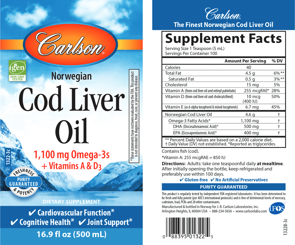 Carlson Cod Liver Oil has received numerous awards for its taste and quality. A single teaspoonful provides 1,100 mg of omega-3s, including EPA and DHA, which support heart, brain, vision, and joint health. To ensure maximum freshness, Cod Liver Oil is closely managed from sea to store.