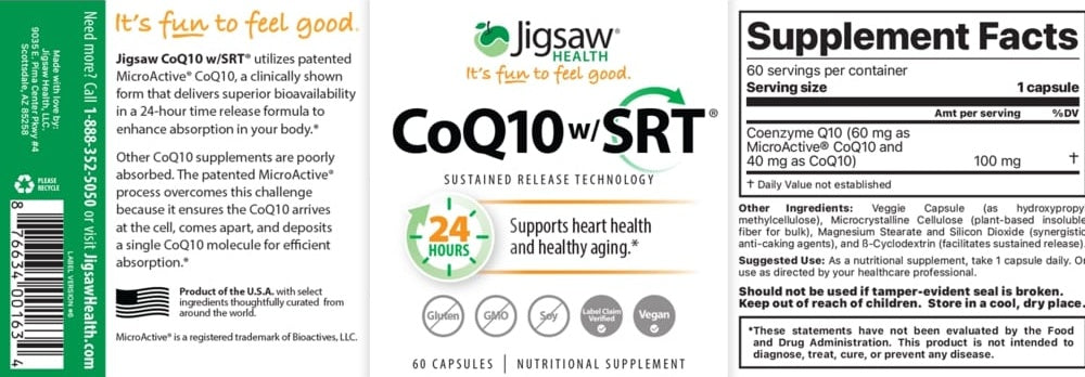CoQ10 is an antioxidant found in every cell of your body and found in even higher concentrations within your kidneys, liver, and heart. Unfortunately, your body’s ability to produce CoQ10 declines naturally with age. Jigsaw CoQ10 w/SRT® utilizes the clinically tested MicroActive® CoQ10 for better, more efficient absorption to replenish CoQ10 levels in your body and promotes heart health, brain function, energy production, and more.*