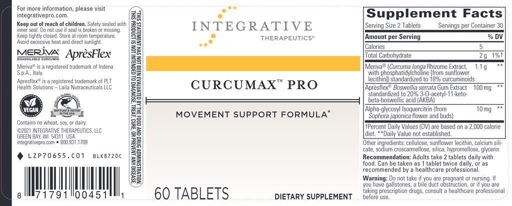Curcumax Pro is for the relief of occasional pain and stiffness associated with overuse. This formula combines effective levels of Meriva® curcumin with ApresFlex® boswellia and alpha-glycosyl isoquercitrin, a highly bioavailable quercetin.*