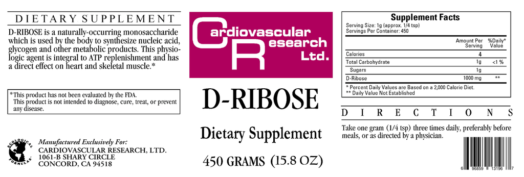 D-Ribose 450 g by Ecological Formulas is a dietary supplement containing a naturally-occurring monosaccharide needed by the body to perform a number of metabolic processes that are essential to good heart health. Because D-Ribose helps to replenish and build new ATP (adenosine triphosphate) in the body, taking a high-quality supplement to ensure enough reserves of D-Ribose may be beneficial.