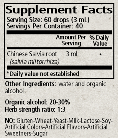 Ingredients: Best quality Chinese Dan Shen root, 1:2 dry, in a base of organic alcohol and spring water.