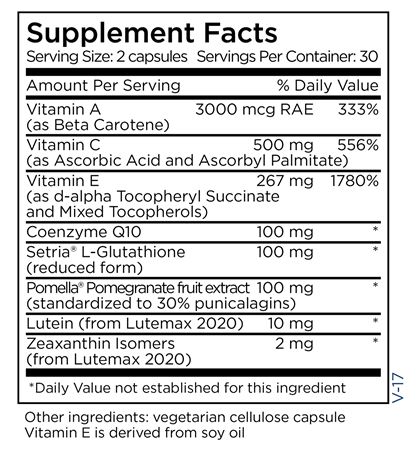Source Materials: Natural mixed carotenoids: carrot and marigold extracts. Ascorbic acid: corn sorbitol. Ascorbyl palmitate: ascorbic acid from corn and palmitic acid from palm oil. Vitamin E succinate and mixed tocopherols: purified soy oil (not an allergen). CoQ10: fermentation. L-Glutathione: fermentation. Pomella® 100% pomegranate. Lutein and zeaxanthin: marigold extract. Cellulose for capsules is derived from softwood tree pulp. All ingredients are vegan and non-GMO.